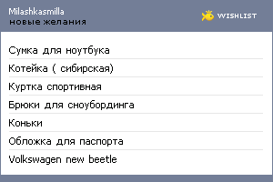Виджеты показывают последние добавления в вишлист. Вы можете разместить (скопировать и вставить HTML-код) виджет своего вишлиста на своем сайте или в блоге. Также вы можете взять виджеты друзей и разместить их на своей стартовой странице. Выберите по вкусу.