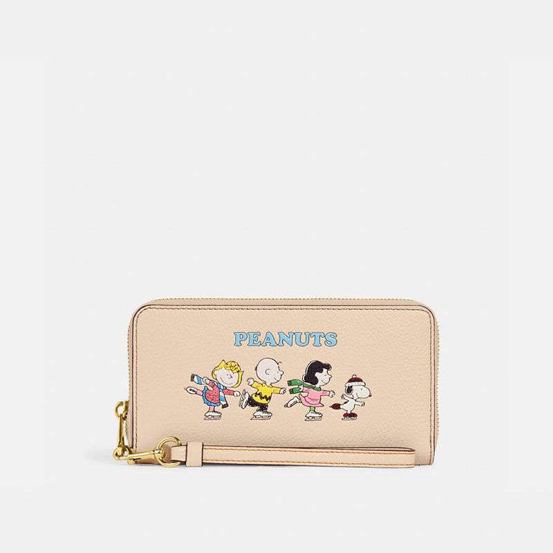 Coach Long Zip Around Wallet in Pebble Leather with Peanuts Snoopy and Friends Motif Apricot