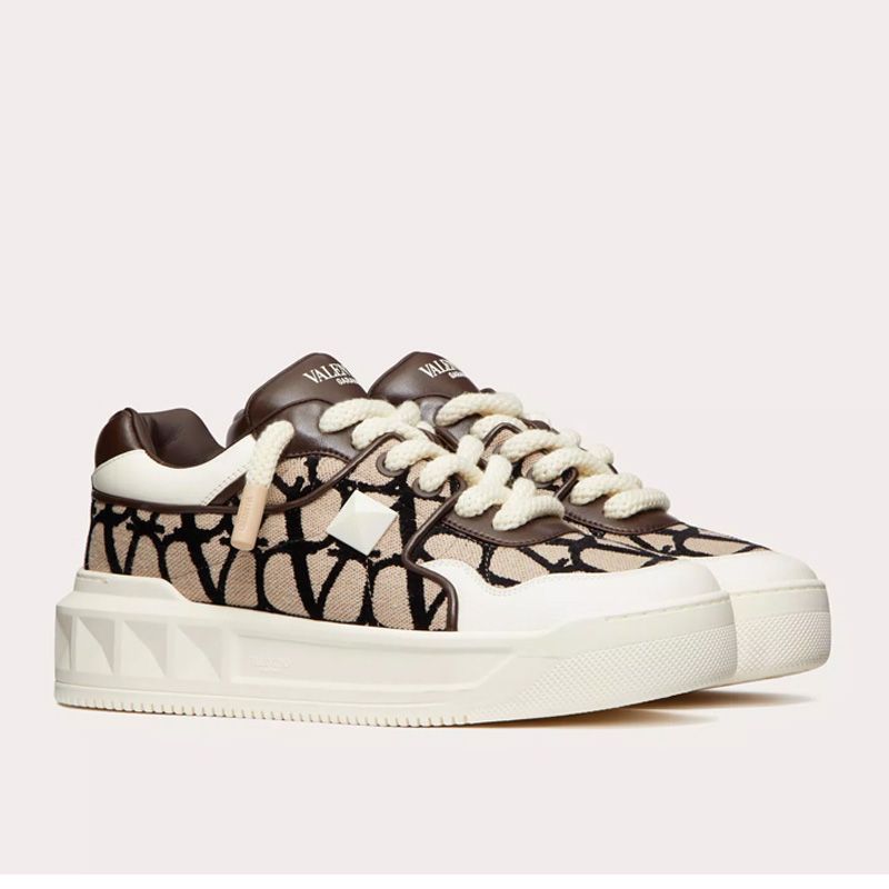 Valentino One Stud XL Low-Top Sneakers Unisex Nappa Leather with Toile Iconographe Fabric Beige