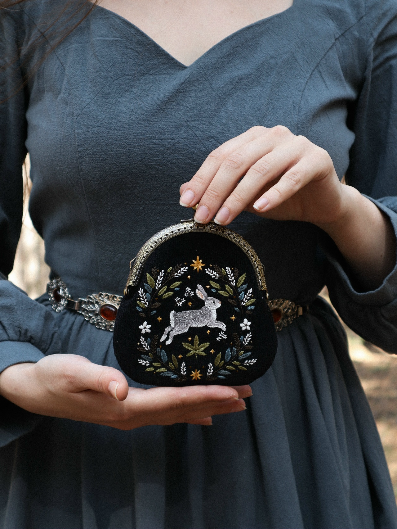2025-10-12 13:00 черная бархатная сумочка, с вышивкой с зайчиком и бронзовой или вроде состаренного золота фурнитурой