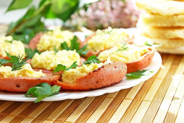 Для начинки: яйцо, сыр, очищенный чеснок натереть на мелкой терке, посолить, заправить майонезом или творожным сыром. Колбасу нарезать тонкими кружочками 1- 2мм. На сковороде разогреть 2 ст.л. сливочного масла, выложить кружочки колбасы - как только колбаса "запузыриться" и подвернутся края, колбасу переложить на тарелку и охладить."Колбасные тарелочки" заполнить начинкой и украсить зеленью. Подавать с подсушенным на сухой сковороде (или в духовке или тостере) хлебом.