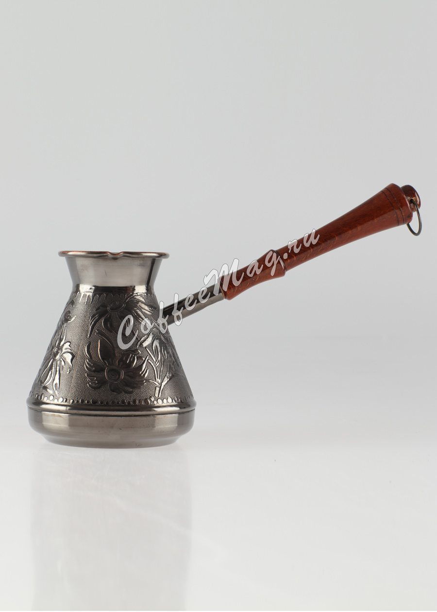 2016-09-09 22:30 медная, с деревянной ручкой, объёмом - на две чашки условного капучино.